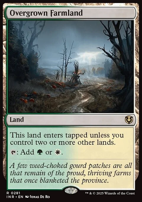 Overgrown Farmland enters tapped unless you control two or more other lands. {T}: Add {G} or {W}.