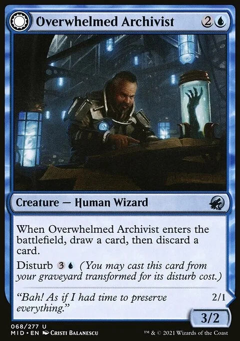 When Overwhelmed Archivist enters the battlefield, draw a card, then discard a card.