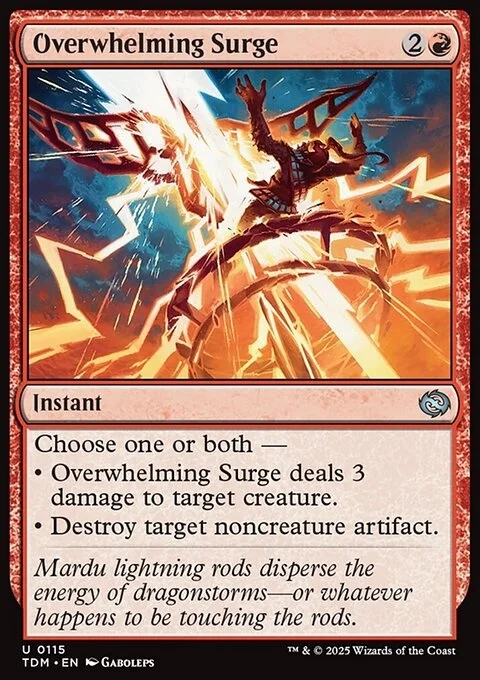 Choose one or both — • Overwhelming Surge deals 3 damage to target creature. • Destroy target noncreature artifact.