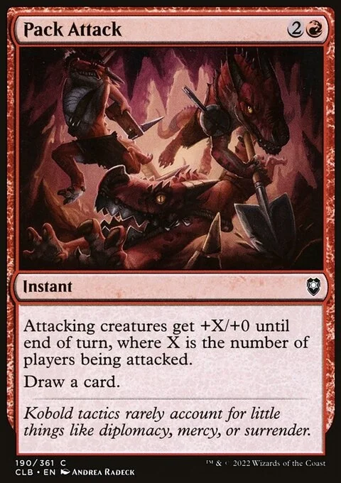 Attacking creatures get +X/+0 until end of turn, where X is the number of players being attacked. Draw a card.