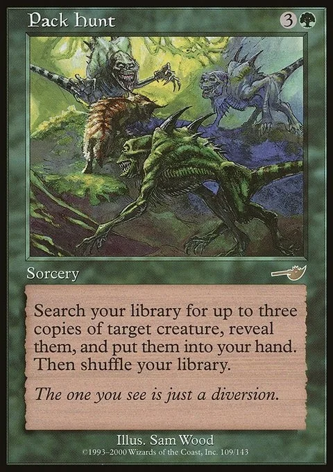 Search your library for up to three cards with the same name as target creature, reveal them, put them into your hand, then shuffle.