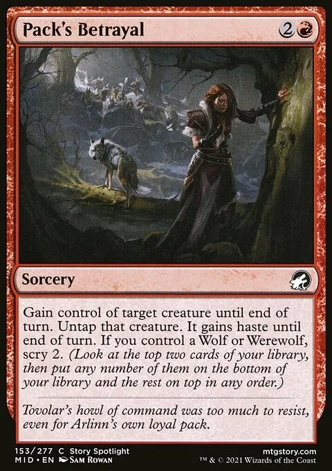 Gain control of target creature until end of turn. Untap that creature. It gains haste until end of turn. If you control a Wolf or Werewolf, scry 2. (Look at the top two cards of your library, then put any number of them on the bottom and the rest on top in any order.)