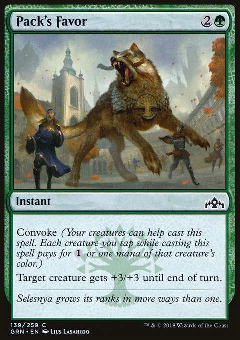 Convoke (Your creatures can help cast this spell. Each creature you tap while casting this spell pays for {1} or one mana of that creature's color.) Target creature gets +3/+3 until end of turn.