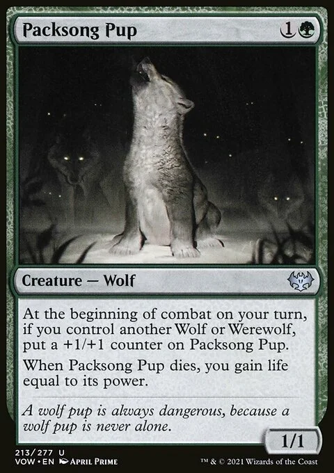 At the beginning of combat on your turn, if you control another Wolf or Werewolf, put a +1/+1 counter on Packsong Pup. When Packsong Pup dies, you gain life equal to its power.