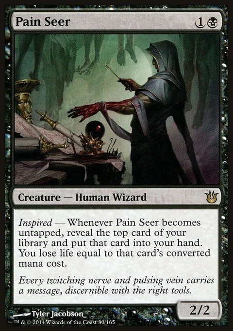 Inspired — Whenever Pain Seer becomes untapped, reveal the top card of your library and put that card into your hand. You lose life equal to that card's converted mana cost.