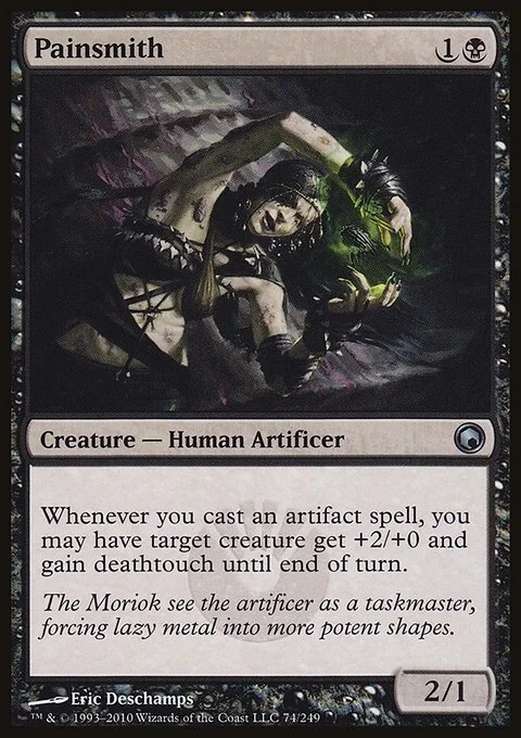 Whenever you cast an artifact spell, you may have target creature get +2/+0 and gain deathtouch until end of turn.