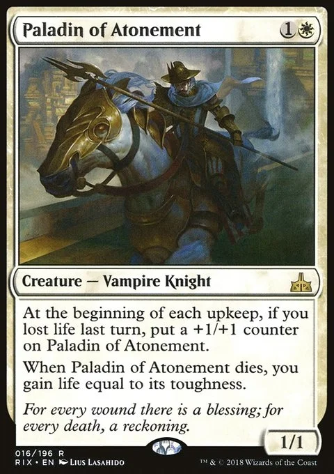 At the beginning of each upkeep, if you lost life last turn, put a +1/+1 counter on Paladin of Atonement. When Paladin of Atonement dies, you gain life equal to its toughness.