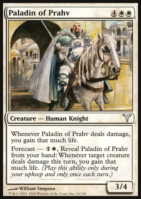 Forecast — {1}{W}, Reveal Paladin of Prahv from your hand: Whenever target creature deals damage this turn, you gain that much life. (Activate only during your upkeep and only once each turn.)