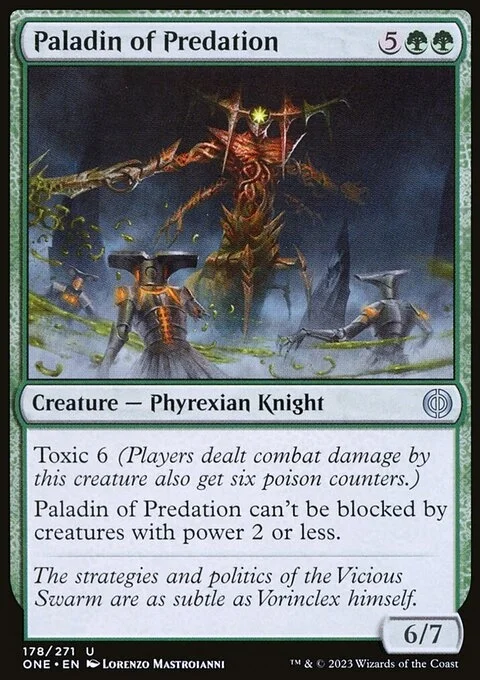 Toxic 6 (Players dealt combat damage by this creature also get six poison counters.) Paladin of Predation can't be blocked by creatures with power 2 or less.
