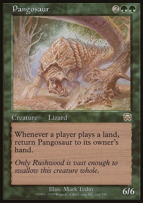 Whenever a player plays a land, return Pangosaur to its owner’s hand.