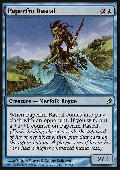 When Paperfin Rascal enters, clash with an opponent. If you win, put a +1/+1 counter on Paperfin Rascal. (Each clashing player reveals the top card of their library, then puts that card on the top or bottom. A player wins if their card had a higher mana value.)