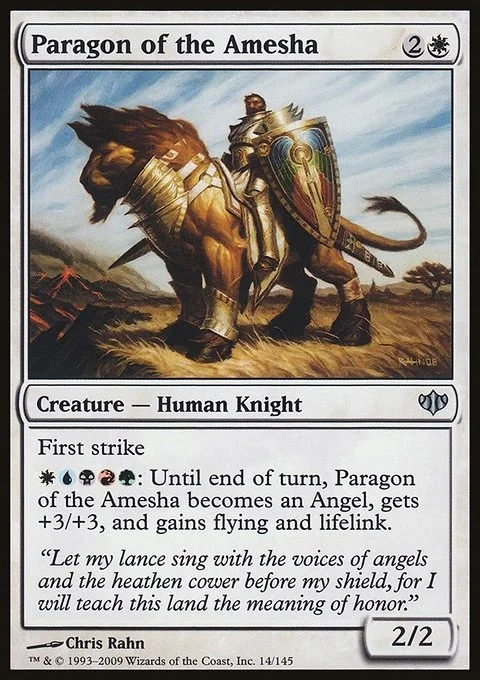 First strike {W}{U}{B}{R}{G}: Until end of turn, Paragon of the Amesha becomes an Angel, gets +3/+3, and gains flying and lifelink.