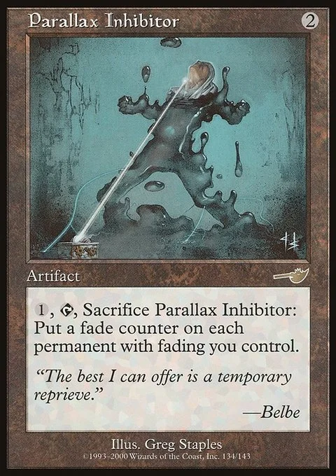 {1}, {T}, Sacrifice Parallax Inhibitor: Put a fade counter on each permanent with fading you control.