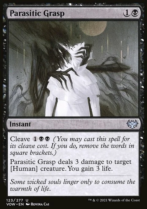 Cleave {1}{B}{B} (You may cast this spell for its cleave cost. If you do, remove the words in square brackets.) Parasitic Grasp deals 3 damage to target [Human] creature. You gain 3 life.