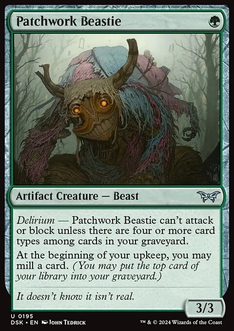 Delirium — Patchwork Beastie can't attack or block unless there are four or more card types among cards in your graveyard. At the beginning of your upkeep, you may mill a card. (You may put the top card of your library into your graveyard.)