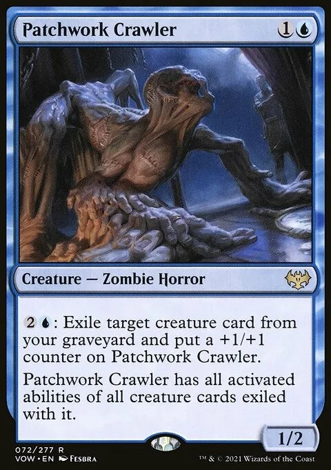 {2}{U}: Exile target creature card from your graveyard and put a +1/+1 counter on Patchwork Crawler. Patchwork Crawler has all activated abilities of all creature cards exiled with it.