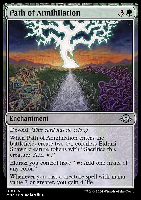 When Path of Annihilation enters the battlefield, create two 0/1 colorless Eldrazi Spawn creature tokens with "Sacrifice this creature: Add {C}."