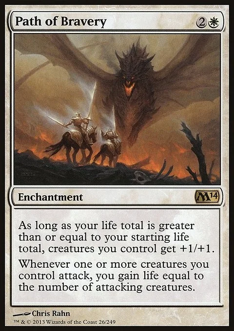 As long as your life total is greater than or equal to your starting life total, creatures you control get +1/+1. Whenever one or more creatures you control attack, you gain life equal to the number of attacking creatures.