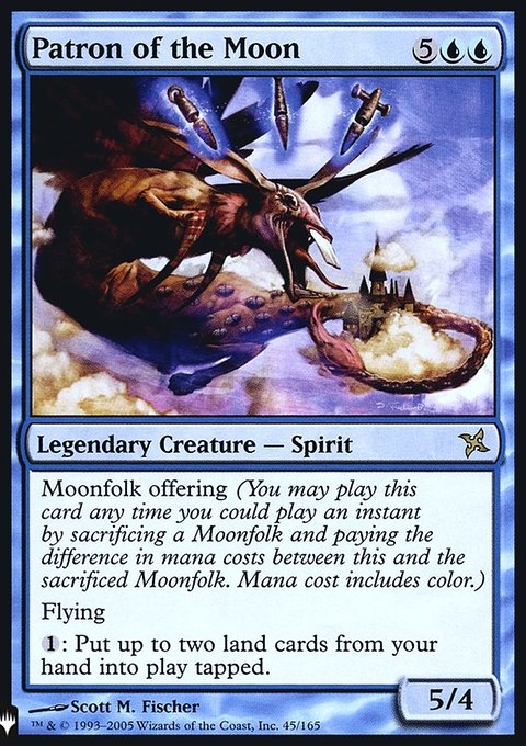 Moonfolk offering (You may cast this spell any time you could cast an instant by sacrificing a Moonfolk and paying the difference in mana costs between this and the sacrificed Moonfolk. Mana cost includes color.)
