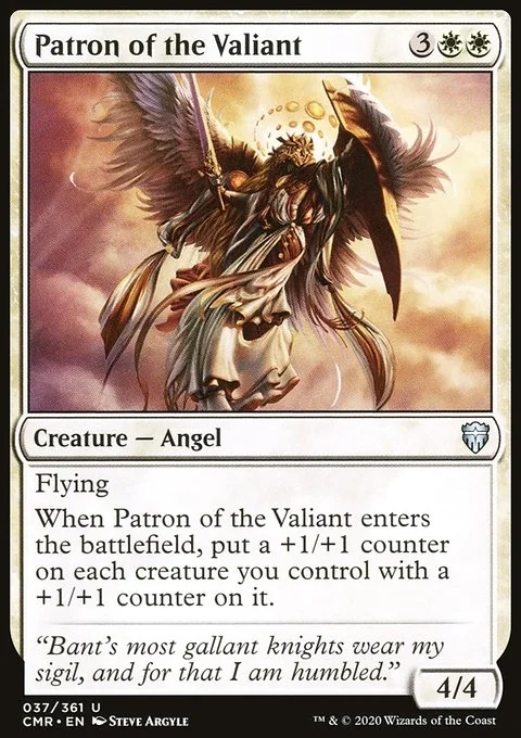 Flying When Patron of the Valiant enters the battlefield, put a +1/+1 counter on each creature you control with a +1/+1 counter on it.