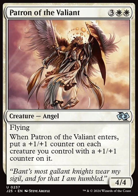Flying When Patron of the Valiant enters, put a +1/+1 counter on each creature you control with a +1/+1 counter on it.