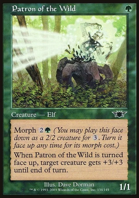 Morph {2}{G} (You may cast this card face down as a 2/2 creature for {3}. Turn it face up any time for its morph cost.) When Patron of the Wild is turned face up, target creature gets +3/+3 until end of turn.