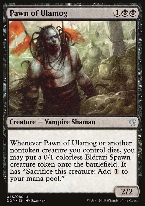 Whenever Pawn of Ulamog or another nontoken creature you control dies, you may create a 0/1 colorless Eldrazi Spawn creature token. It has "Sacrifice this creature: Add {C}."