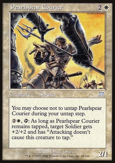 You may choose not to untap Pearlspear Courier during your untap step. {2}{W}, {T}: Target Soldier creature gets +2/+2 and has vigilance for as long as Pearlspear Courier remains tapped.