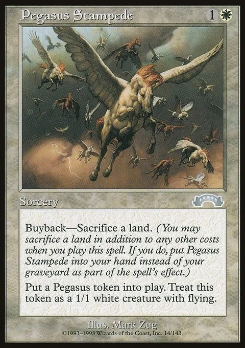 Buyback—Sacrifice a land. (You may sacrifice a land in addition to any other costs when you play this spell. If you do, put Pegasus Stampede into your hand instead of your graveyard as part of the spell’s effect.) Put a Pegasus token into play. Treat this token as a 1/1 white creature with flying.