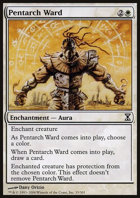 Enchant creature As Pentarch Ward enters, choose a color. When Pentarch Ward enters, draw a card. Enchanted creature has protection from the chosen color. This effect doesn't remove Pentarch Ward.