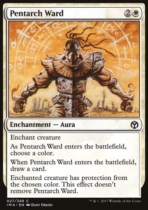 Enchant creature As this Aura enters, choose a color. When this Aura enters, draw a card. Enchanted creature has protection from the chosen color. This effect doesn't remove this Aura.