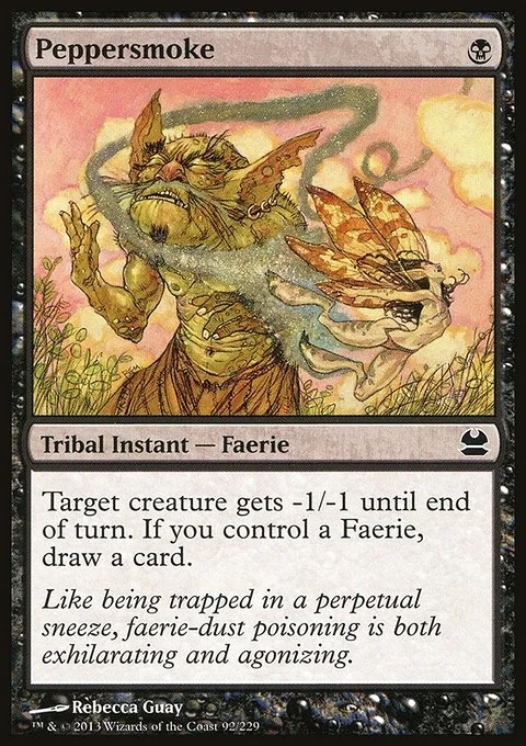 Target creature gets -1/-1 until end of turn. If you control a Faerie, draw a card.