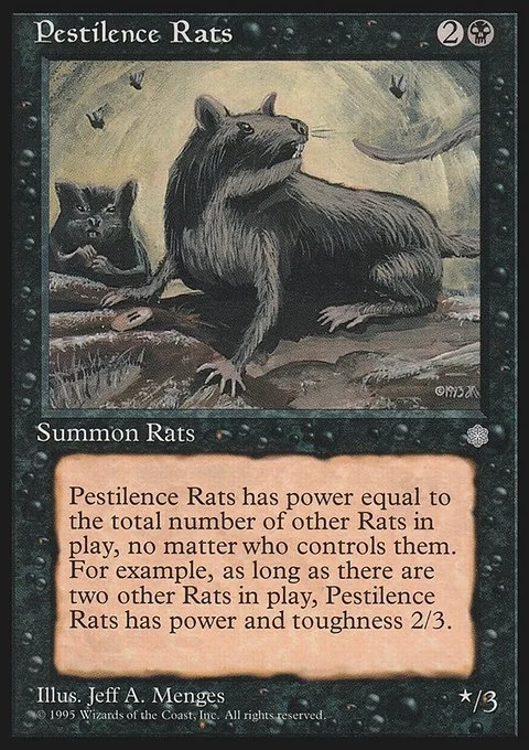 Pestilence Rats has power equal to the total number of other Rats in play, no matter who controls them. For example, as long as there are two other Rats in play, Pestilence Rats has power and toughness 2/3.