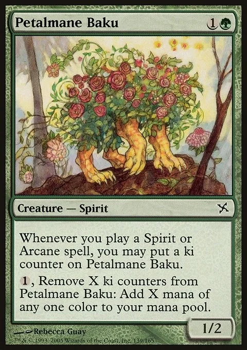 Whenever you cast a Spirit or Arcane spell, you may put a ki counter on Petalmane Baku. {1}, Remove X ki counters from Petalmane Baku: Add X mana of any one color.