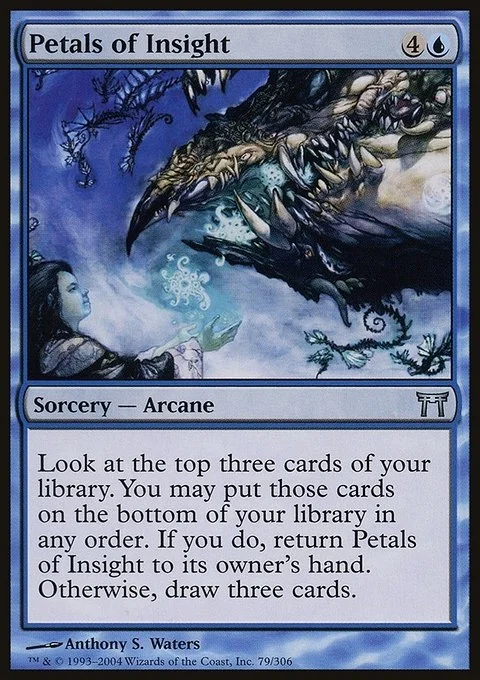 Look at the top three cards of your library. You may put those cards on the bottom of your library in any order. If you do, return Petals of Insight to its owner's hand. Otherwise, draw three cards.