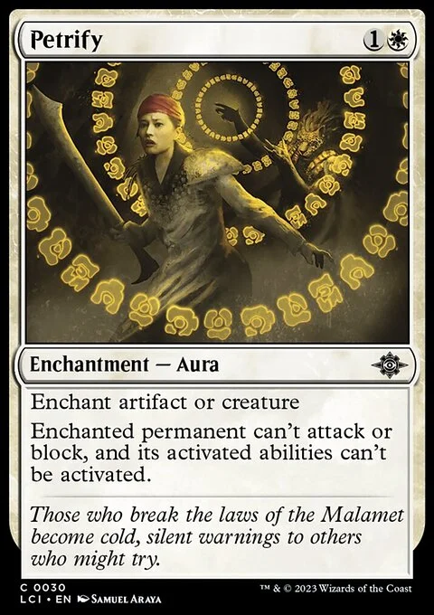 Enchant artifact or creature Enchanted permanent can't attack or block, and its activated abilities can't be activated.