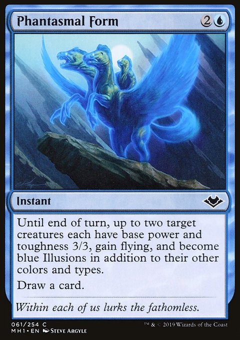 Until end of turn, up to two target creatures each have base power and toughness 3/3, gain flying, and become blue Illusions in addition to their other colors and types. Draw a card.