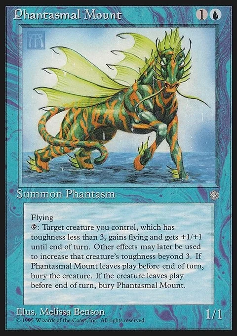 FlyingT: Target creature you control, which has toughness less than 3, gains flying and gets +1/+1 until end of turn. Other effects may later be used to increase that creature’s toughness beyond 3. If Phantasmal Mount leaves play before end of turn, bury the creature. If the creature leaves play before end of turn, bury Phantasmal Mount.