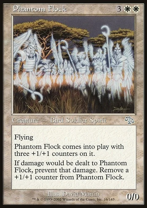 Flying Phantom Flock enters the battlefield with three +1/+1 counters on it. If damage would be dealt to Phantom Flock, prevent that damage. Remove a +1/+1 counter from Phantom Flock.