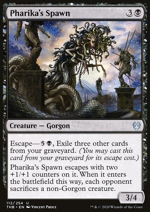 Pharika's Spawn escapes with two +1/+1 counters on it. When it enters the battlefield this way, each opponent sacrifices a non-Gorgon creature.