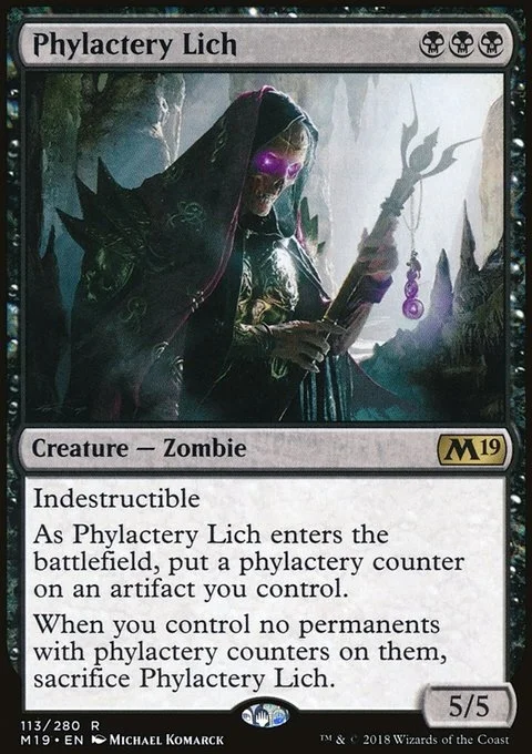 Indestructible As Phylactery Lich enters the battlefield, put a phylactery counter on an artifact you control. When you control no permanents with phylactery counters on them, sacrifice Phylactery Lich.