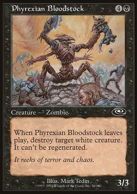 When Phyrexian Bloodstock leaves the battlefield, destroy target white creature. It can't be regenerated.