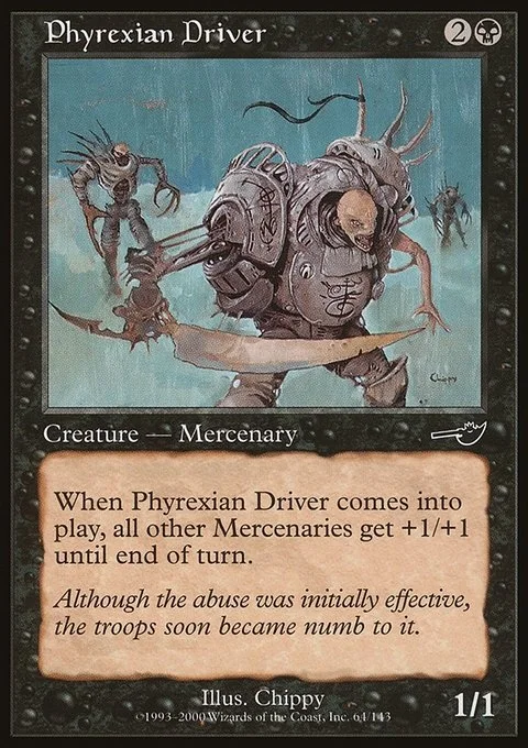 When Phyrexian Driver enters the battlefield, other Mercenary creatures get +1/+1 until end of turn.