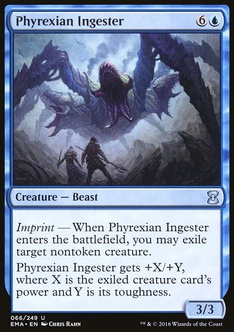 Imprint — When Phyrexian Ingester enters the battlefield, you may exile target nontoken creature. Phyrexian Ingester gets +X/+Y, where X is the exiled creature card's power and Y is its toughness.