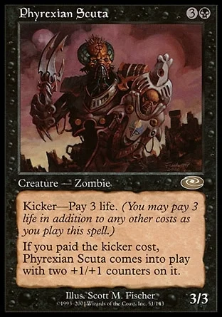 If you paid the kicker cost, Phyrexian Scuta comes into play with two +1/+1 counters on it.