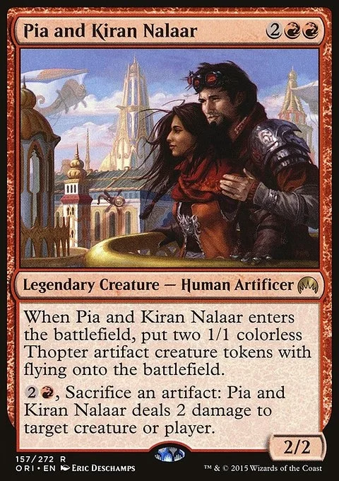 When Pia and Kiran Nalaar enters the battlefield, create two 1/1 colorless Thopter artifact creature tokens with flying. {2}{R}, Sacrifice an artifact: Pia and Kiran Nalaar deals 2 damage to any target.