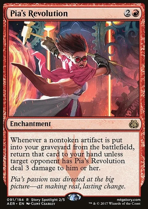 Whenever a nontoken artifact is put into your graveyard from the battlefield, return that card to your hand unless target opponent has Pia's Revolution deal 3 damage to them.