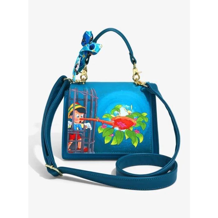 On the front design of this bag, Pinoke’s nose takes the stage, complete with bluebirds and embroidered flowers as the little wooden boy looks on in shock. On the back, his appointed conscience, Jiminy Cricket, strikes a proud pose. Inside, the bag boasts two storage compartments as well as a Pinocchio-themed print. The print matches the silk-like bow of the removable handle, which can be switched out for an adjustable shoulder strap.