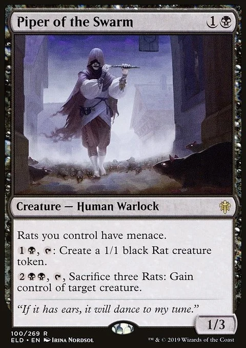 Rats you control have menace. {1}{B}, {T}: Create a 1/1 black Rat creature token. {2}{B}{B}, {T}, Sacrifice three Rats: Gain control of target creature.