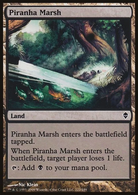 Piranha Marsh enters tapped. When Piranha Marsh enters, target player loses 1 life. {T}: Add {B}.